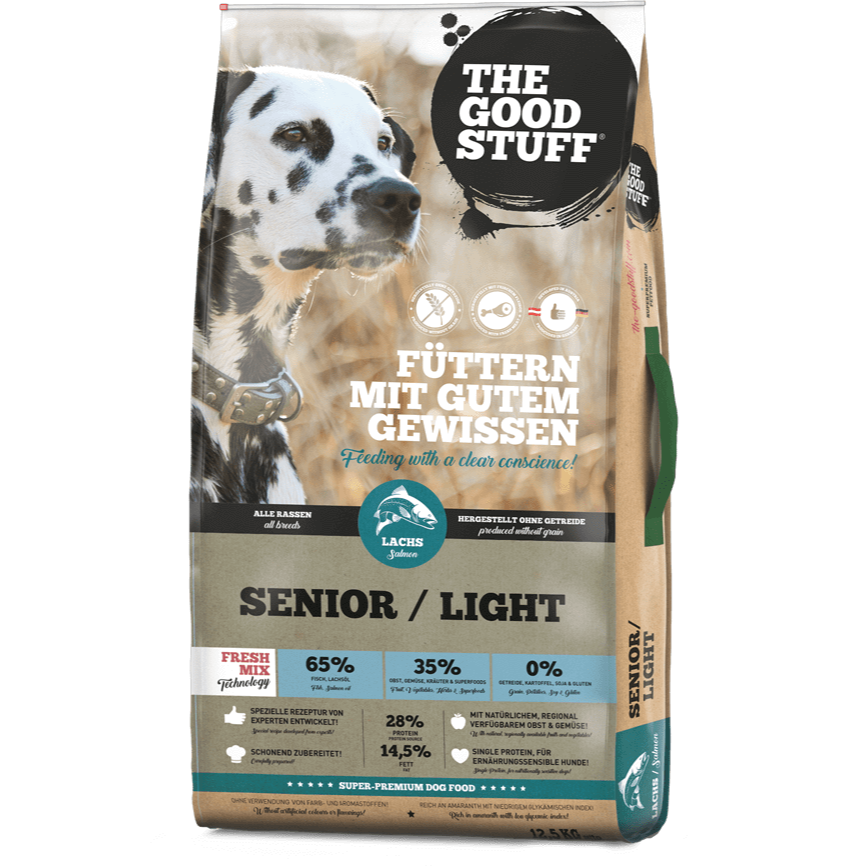 TROCKENFUTTER LACHS für ältere Hunde oder erwachsene Hunde mit geringer Aktivität in bewährter THE GOODSTUFF Super Premium-Qualität. Ein ideales Alleinfuttermittel für Hunde aller Rassen und Größen. Schonend hergestellt ohne Getreide, reich an frischem Lachs in Lebensmittelqualität, Amaranth mit niedrigem glykämischen Index, regional verfügbarem Obst & Gemüse sowie ausgewählten Kräutern. Dank Chondroitin & Glucosamin aus natürlichen Quellen sorgt diese spezielle Sorte von THE GOODSTUFF für eine optimale Unterstützung gesunder Gelenke.
